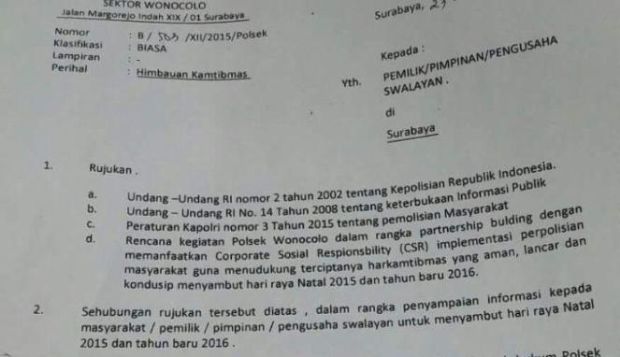 Bahkan, Polsek Wonocolo sudah mengeluarkan surat imbauan. Surat yang bernomor B/503/XII/2015/Polsek, dengan perihal Imbauan Kamtibmas itu sudah diedarkan ke masyarakat. Isi surat itu meminta kepada seluruh pimpinan perusahaan agar tak memaksa karyawan dan karyawatinya yang Muslim mengenakan atribut sinterklas.