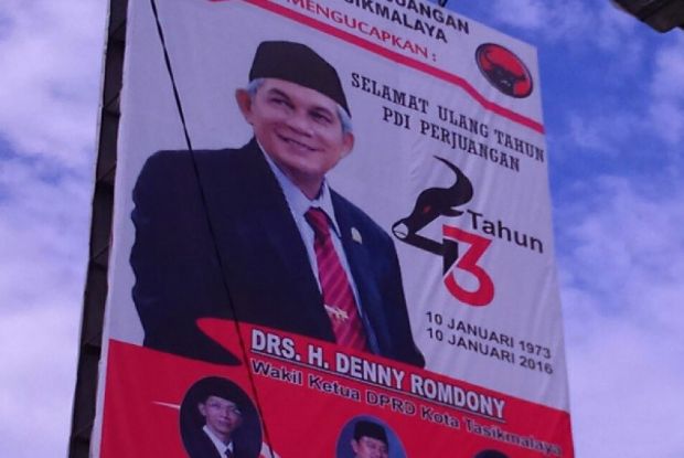 TASIKMALAYA (SALAM-ONLINE): Baliho HUT ke-43 Partai Demokrasi Indonesia Perjuangan (PDIP) di Kota Tasikmalaya, Jawa Barat, menuai polemik. Sebab, angka 43 yang tertera pada baliho tersebut dinilai menyerupai simbol palu dan arit sehingga pengurus PDIP di Kota Tasikmalaya terpaksa mencopot baliho tersebut.