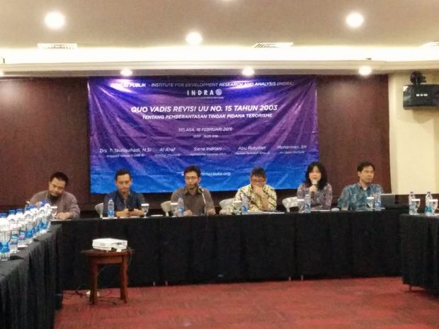 Untuk itu Institute for Development Research and Analysis (INDRA Institute) menghelat sebuah diskusi bertajuk ‘Quo Vadis Revisi UU No 15 Tahun 2003 tentang Pemberantasan Tindak Pidana Terorisme’ di Jakarta, Selasa (16/2/2016). Tampil sebagai nara sumber: T. Taufiqulhadi (Anggota Komisi III DPR RI), Al A’raf (Direktur Imparsial), Siane Indriani (Komisioner Komnas HAM), Abu Rusydan (mantan tertuduh Amir JI) dan Munarman (An Nashr Institute).