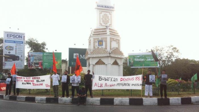 Sesampai di Bundaran Simpang Lima, massa membentangkan dua spanduk dan beberapa karton yang bertuliskan “Bubarkan Densus 88! Alat Penjajah Pembantai Umat Muslim”, “Densus 88 Alat Amerika untuk Memerangi Islam Atas Nama Terorisme”, dan “Bubarkan, Densus 88 Penebar Teror”.