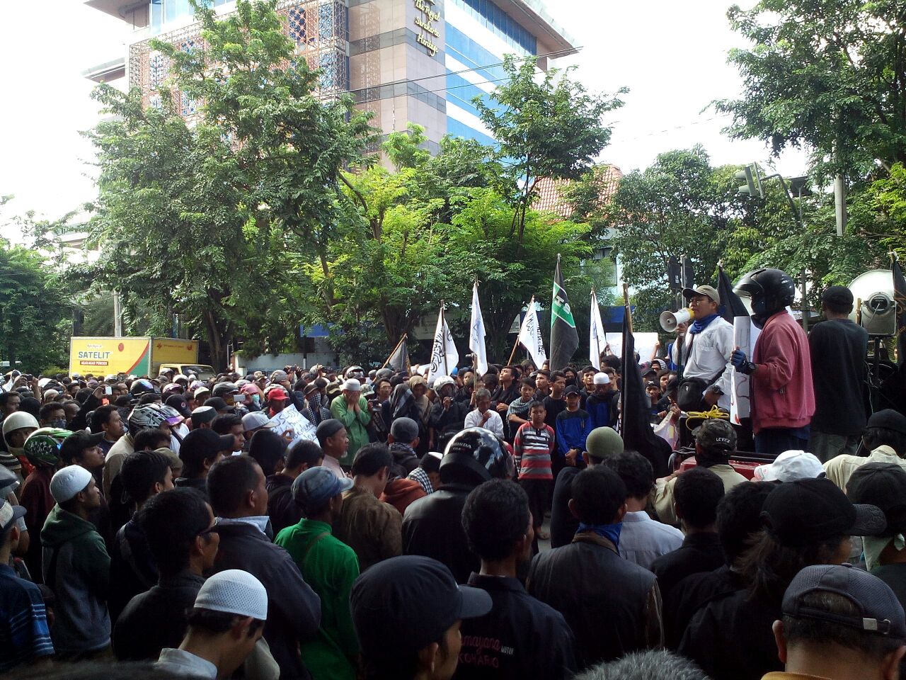 SOLO (SALAM-ONLINE): Sekitar 700-an massa yang tergabung dalam Komunitas Nahi Munkar Surakarta (KONAS) Selasa (15/3) siang menggelar aksi damai di Bundaran Gladag, Solo, untuk meminta kepada Presiden Jokowi agar membubarkan Densus 88.
