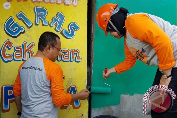 SURABAYA (SALAM-ONLINE): Wali Kota Surabaya Tri Rismaharini mengecat rumah nelayan di kawasan Cumpat, Kecamatan Bulak, agar terlihat indah dan tidak kumuh sekaligus sebagai puncak kegiatan “Bulak Fest 2016”.