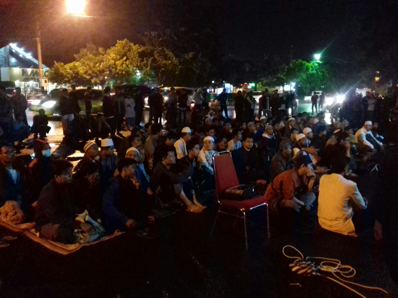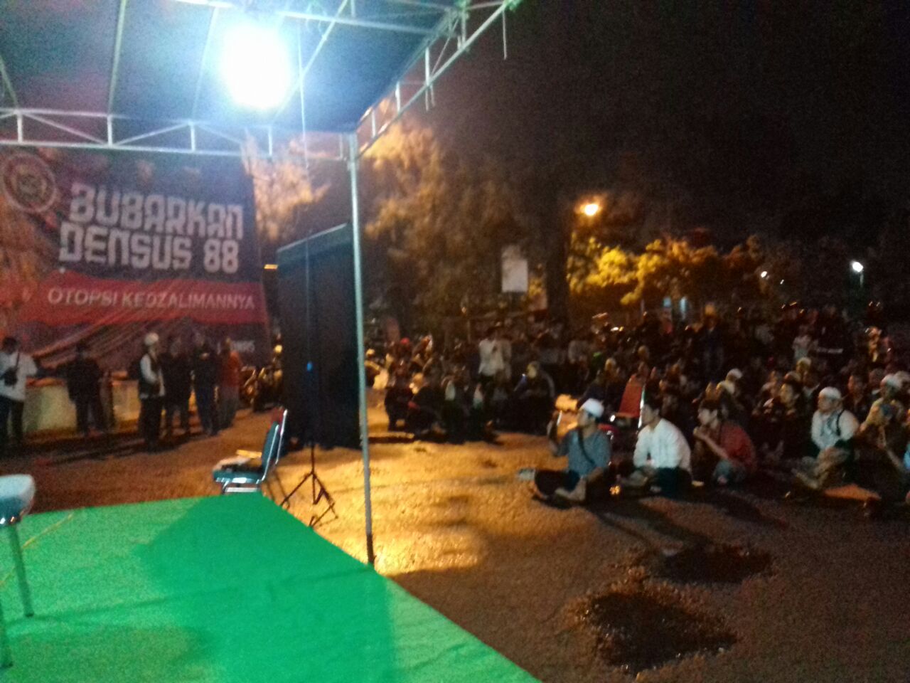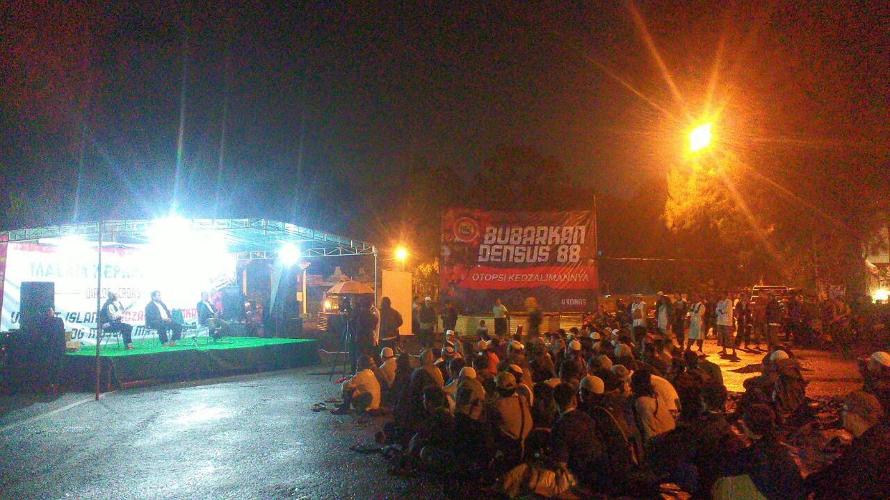 SOLO (SALAM-ONLINE): Meski hujan gerimis masih turun, ratusan warga Solo memadati halaman Gerbang Selatan Stadion Manahan, Sabtu (9/4) malam, pada acara Malam Keprihatinan dalam bentuk Dialog Cerdas untuk Advokasi Siyono.