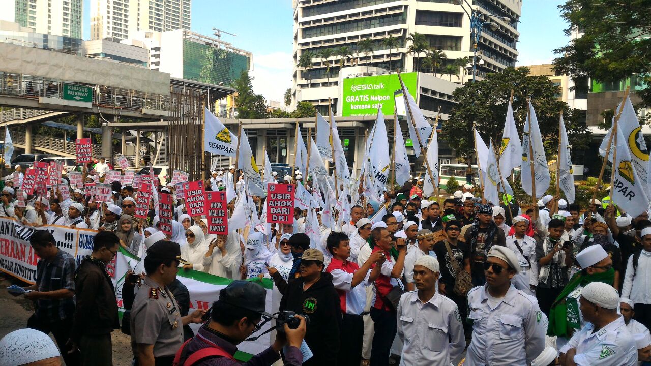 JAKARTA (SALAM-ONLINE): Gerakan Masyarakat Jakarta (GMJ) bersama para ulama, tokoh dan ribuan massa menggelar demo di depan gedung Komisi Pemberantasan Korupsi (KPK) pada Senin (4/4) guna menuntut agar gubernur DKI Jakarta Basuki Tjahaja Purnama alias Ahok segera dipanggil untuk diproses secara adil dan transparan.