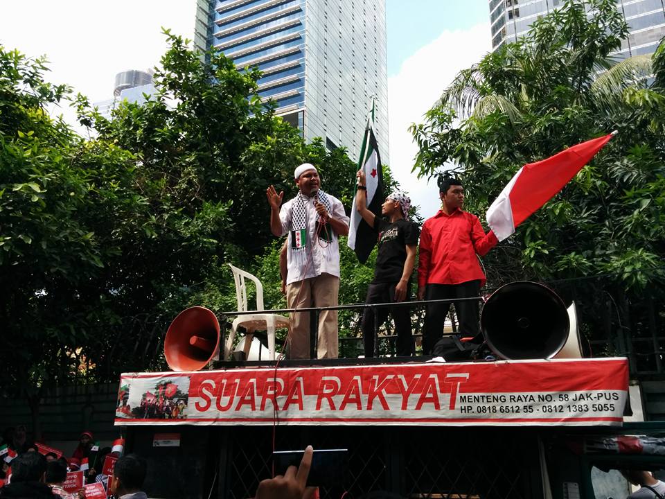 Tiga kelompok pendemo, yaitu Jamaah Ansharus Syariah (JAS), Forum Silaturahim Lembaga Dakwah Kampus (FSLDK) Jakarta-Depok-Bekasi dan Aliansi Merah Putih Peduli Suriah, sambung menyambung sejak pagi hingga jelang waktu Ashar menggelar aksi, orasi dan teatrikal.