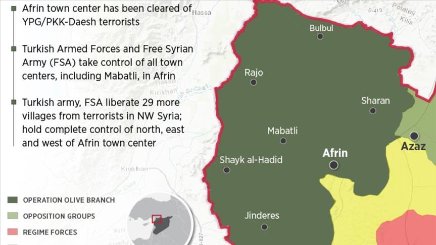 Pusat kota Afrin sekarang berada di bawah kendali penuh Turki dan FSA, baik dari sisi utara, timur dan baratnya. Pusat kota Mabatli juga dibebaskan dari teroris oleh tentara Turki. (S)