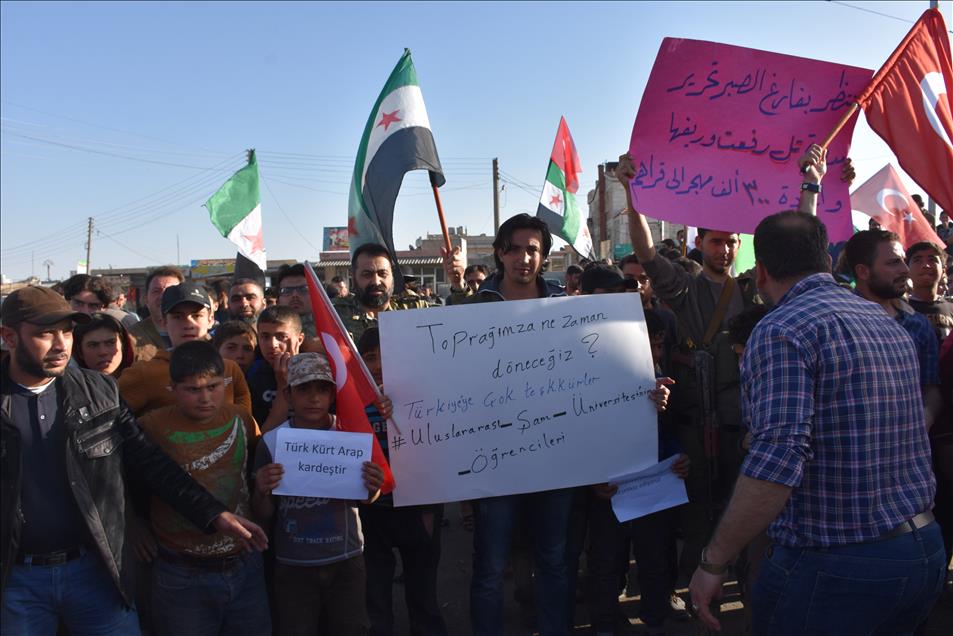 Mereka meneriakkan slogan-slogan melawan kelompok teror YPG/PKK dan mengucapkan terima kasihnya kepada Turki atas operasinya di wilayah Afrin.