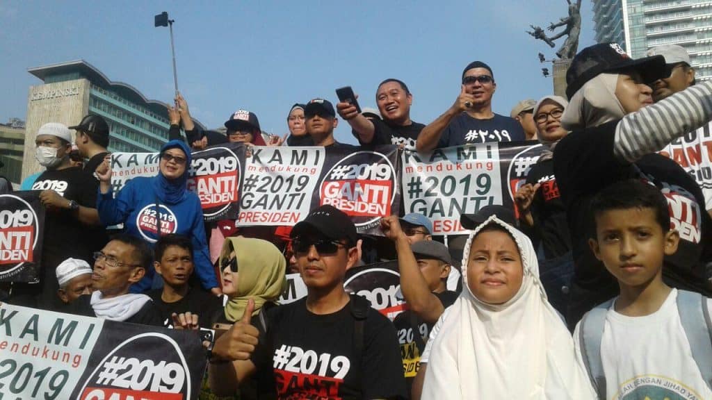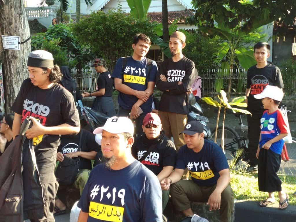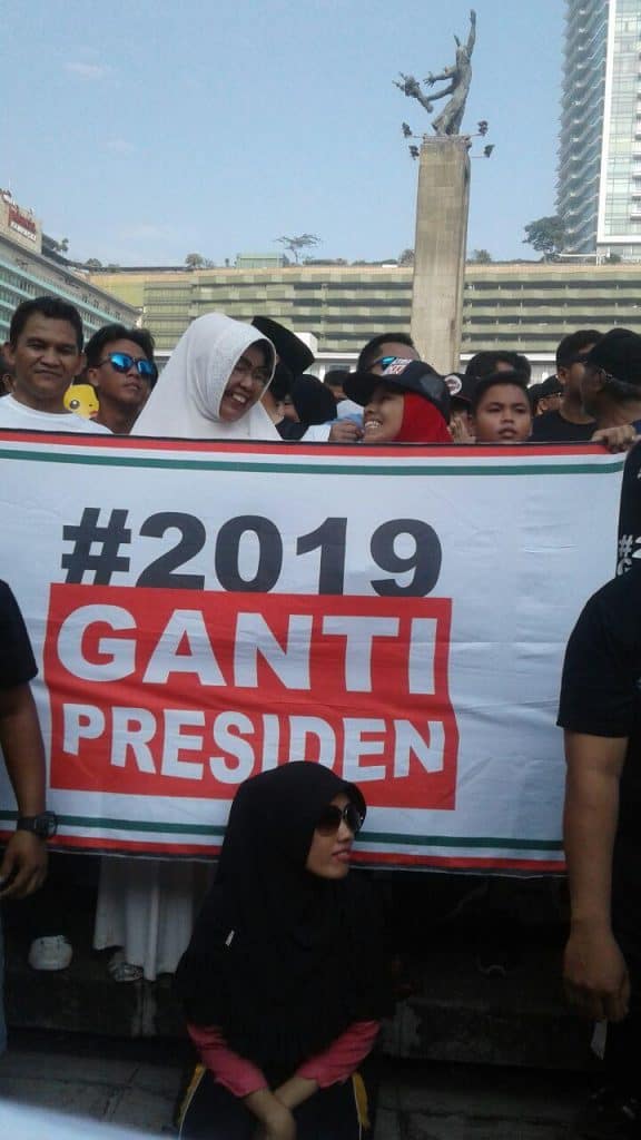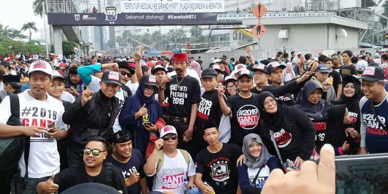 Selain mengenakan kaus, sebagian juga membawa poster dan spanduk dengan tulisan bertagar sama. Mereka juga ramai-ramai meneriakkan yel-yel “Ganti Presiden 2019”. Warga masyarakat yang hadir tak hanya datang dari Jakarta. Sebagian mereka datang dari Bogor, Depok, Tangerang dan Bekasi.