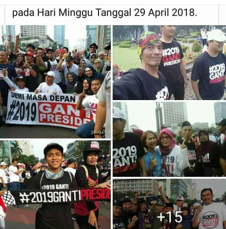 JAKARTA (SALAM-ONLINE): Area Hari Bebas Kendaraan (Car Free Day) di berbagai kota dan daerah di Indonesia pada setiap Ahad, pada 29 April 2018 ini, mulai diramaikan dengan kaus dan topi bertagar #2019GantiPresiden.