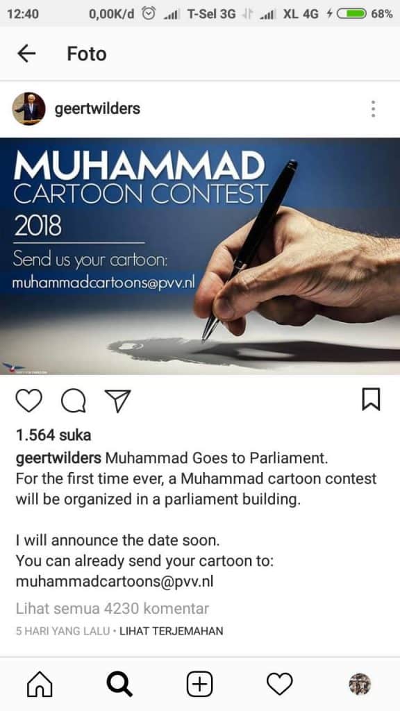 “Muhammad Goes to Parliament, untuk pertama kalinya, kontes kartun (Nabi) Muhammad akan diorganisir di Gedung Parlemen,” tulis Wilders di Instagramnya lima hari lalu.