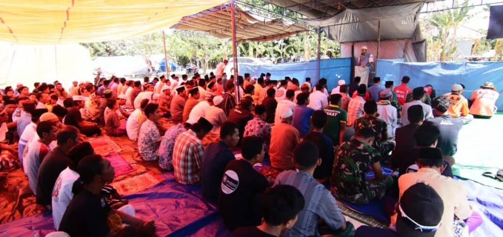 Dalam nuansa pasca gempa dan susul menyusul gempa setelahnya, masyarakat Desa Sembalun Bumbung tak mau ketinggalan untuk selalu menegakkan shalat meski di masjid darurat, menjaga takwa di tanah gempa. (A. Jilul Qur’ani Farid/INA)