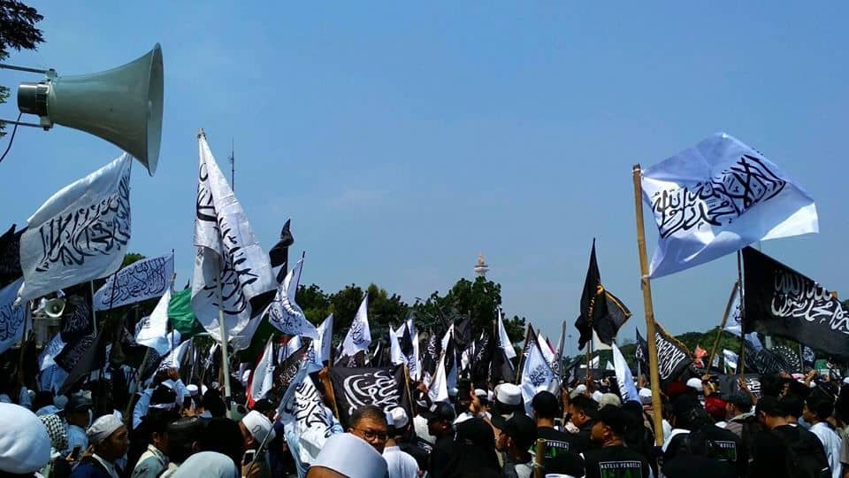 JAKARTA (SALAM-ONLINE): Puluhan ribu massa, Jumat (2/11/2018) siang ini kembali menggelar aksi di sekitaran Patung Kuda dan Jalan Medan Merdeka Barat, Jakarta Pusat, untuk memprotes pembakaran bendera berlafadz tauhid di Garut beberapa waktu lalu.