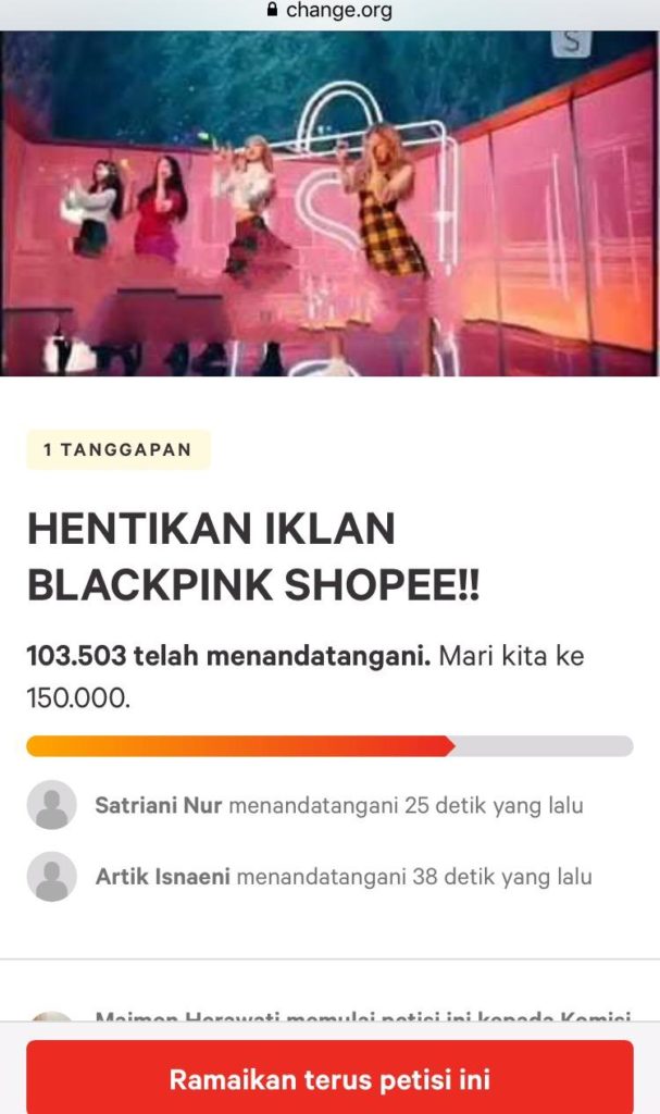 Setelah mendapat informasi cukup jelas mengenai tayangan iklan itu, pada Jumat (7/12) malam lalu, Maimon pun membuat petisi di change.org bertema “HENTIKAN IKLAN BLACKPINK SHOPEE!! Isi Petisi itu menyebut: