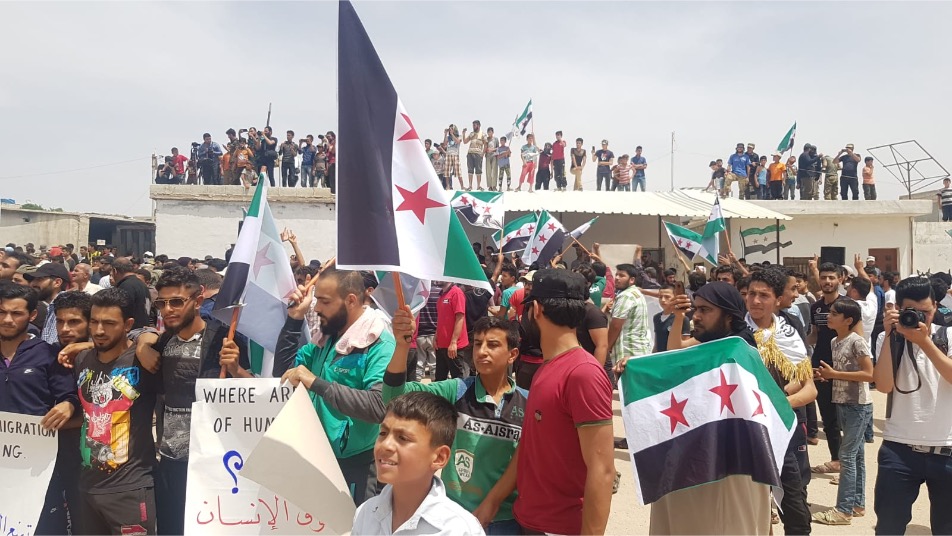Para pengunjuk rasa berkumpul di dekat daerah penyeberangan Atmeh, meneriakkan slogan-slogan menentang Basyar Asad dan Vladimir Putin (presiden Rusia). Mereka juga menyerukan negarara penjamin (Turki) agar menggunakan pengaruhnya untuk menghentikan serangan dan pengeboman terhadap warga sipil.