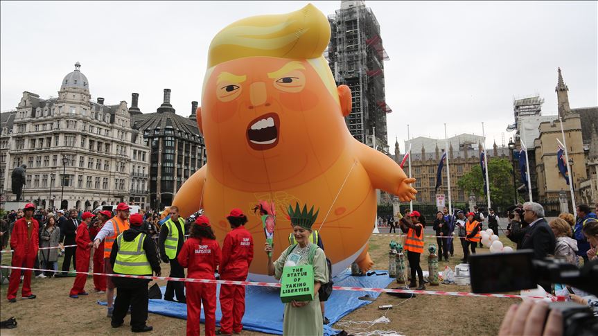 Bayi balon Trump setinggi 20 kaki dipompa dan melayang di alun-alun di lokasi di mana kendaraan lapis baja Trump lewat untuk menuju ke pertemuan dengan May.